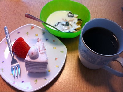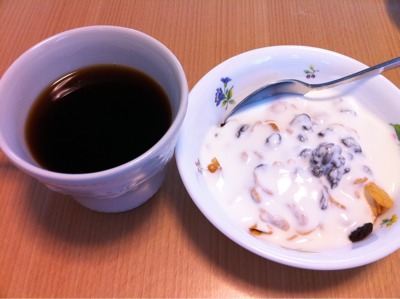朝食7:00:シリアル+ヨーグルト、みかん、コーヒー