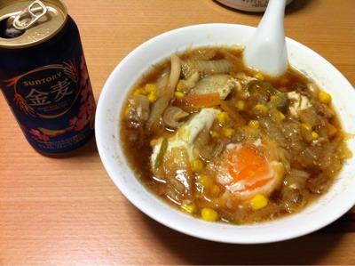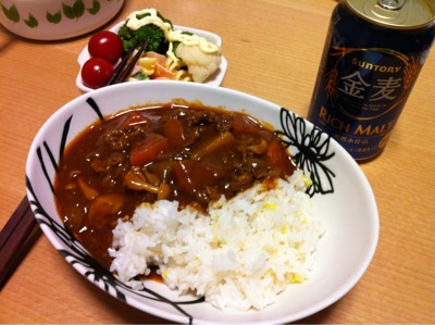 夕食20:30:ハッシュドビーフ、サラダ、ビール1本、焼酎水割り2杯