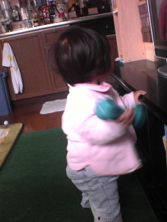 手に持って振り回しているのは鉄アレイ1Kg。といってもトレーニングをしているわけではありません。なんでも拾い上げてテレビにぶつけようとしてるんです…。そんなものぶつけられたら大変です。力もつけてきています。