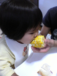 初めてのトウモロコシに最初は恐る恐る口にしてましたが、美味しいのが分かるとかぶりついて、口から離そうとすると怒ってました(笑)