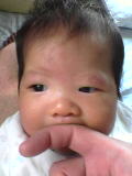 オッパイが欲しくなってもママが用事をしているとすぐにはあげられない。しばらくは気を散らしたりしてあやしていても、やはり空腹には耐えられるはずもなく泣きはじめる。泣いてる様子もカワイイんだけどあんまりかわいそうなのでオッパイの代わりに指でガマンしてもらった。何か違うと感じながらもその幸せそうな表情を見ているとこっちも幸せな気分になります。