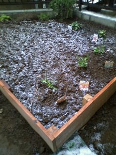 2週間くらい前に植えたカンパニュラとスイートピーの苗にも雪が積もってます。