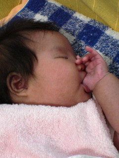オッパイが欲しくなると自分の手をなめていたんだけど、ついに親指を吸う事を覚えてしまいました…衛生的には気になるところだけど、まぁしょうがないですね。しばらくは様子見です。眠気と闘いながら指をしゃぶっている様子はかなりカワイイです(^.^)