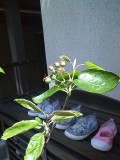 ジューンベリーはまだ小さな苗ですが、もう花が咲いて実がついています。