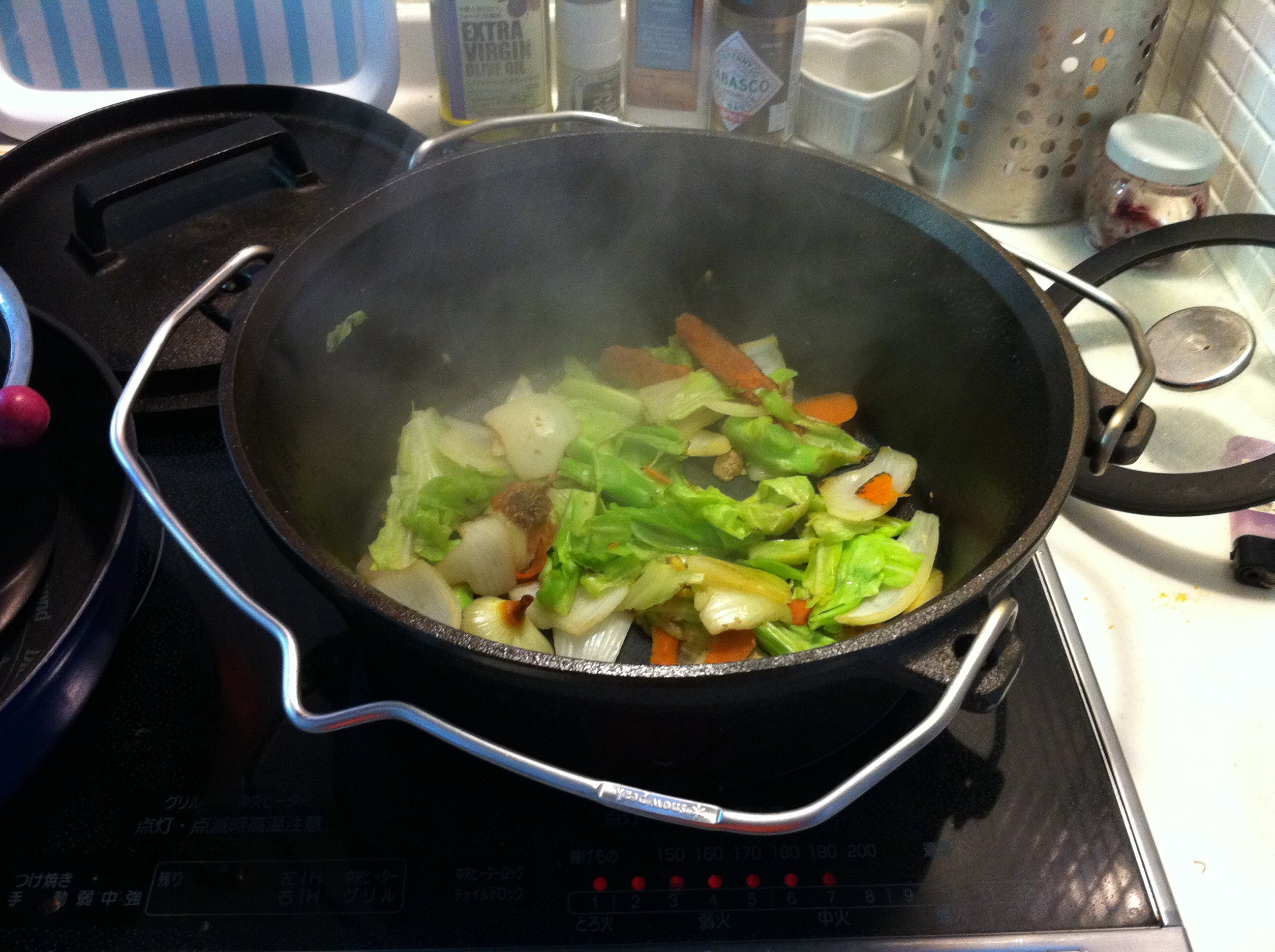 その前に慣らしの最終作業、くず野菜を炒めもやってみました。