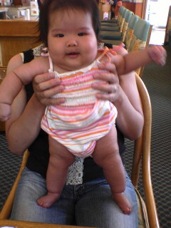 残暑お見舞いに使う写真を撮りにお出かけした帰りにファミレスでランチです。まだおっぱいとお茶しか飲めないので、私たちが美味しそうに食べているのを見て羨ましそうにしていました。デザートを見つめてたのでスプーンの先にちょっとつけて舐めさせると不思議な顔をしていました。あと二ヶ月もすれば離乳食を与えられるようになりますが、もうしばらくはお預けですよ。