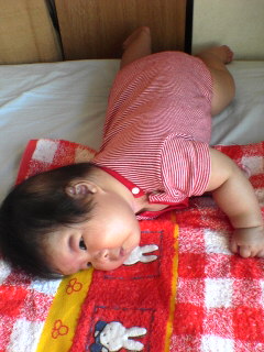 初の寝返りをしてました(>_<)顔を洗っていると「あーっ!」と妻が大きな声を出したので見にいくときれいにうつぶせになって満足そうな表情です。でもまだ完全にコツをマスターしていないのでその後はまだ大声を出しながら悪戦苦闘してます。いよいよ動き出すと目が離せなくなります。