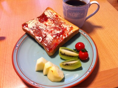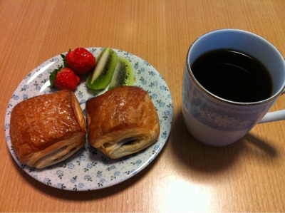 朝食7:00:チョコパン、フルーツ、ヨーグルト、コーヒー