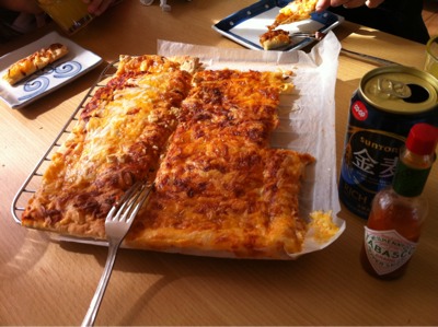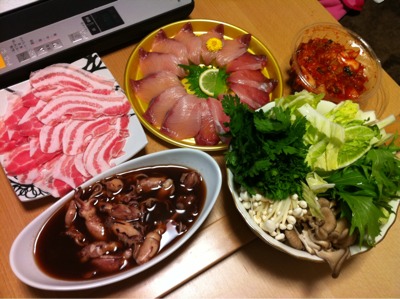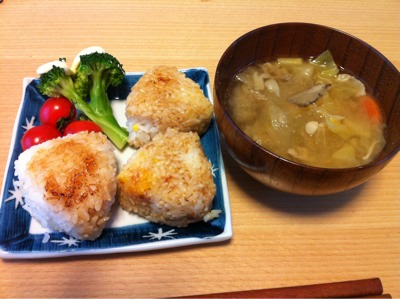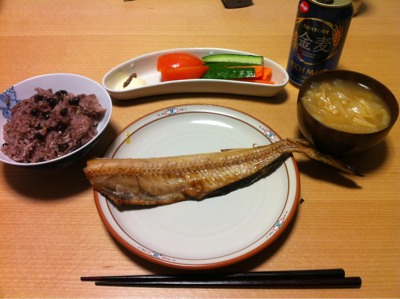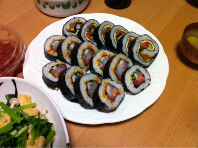 夕食19:00:恵方巻き、豚汁、小松菜の煮浸し、ビール1本、焼酎お湯割り2杯