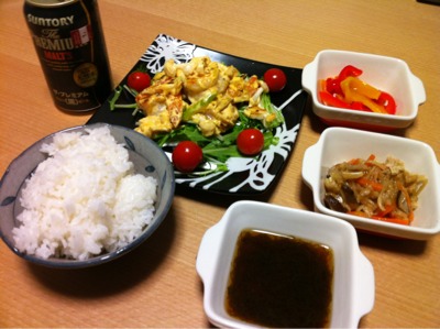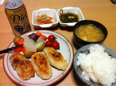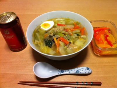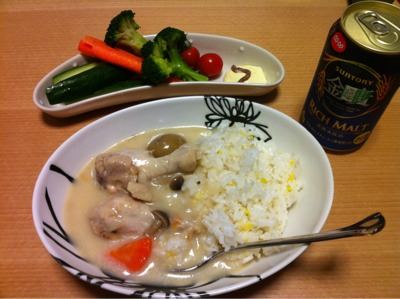 夕食22:00:シチュー、野菜スティックサラダ、ビール1本、焼酎水割り2杯