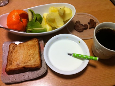 朝食7:00:キャラメルパン、ヨーグルト、フルーツ、コーヒー