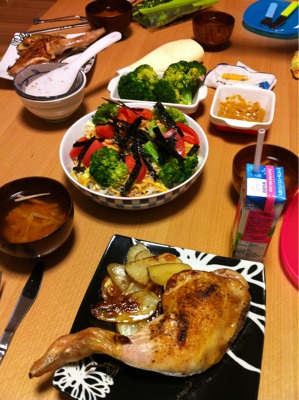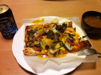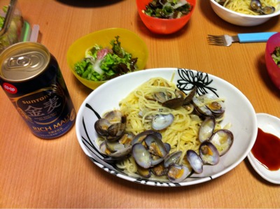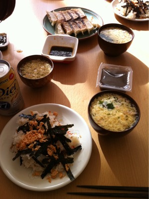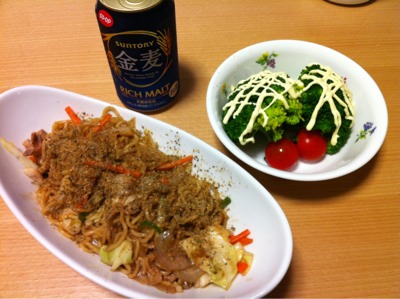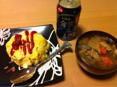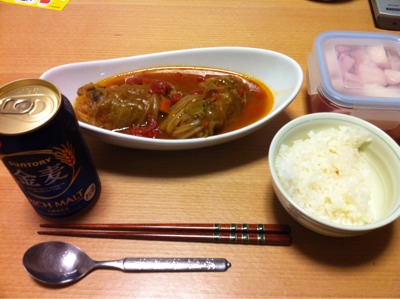 夕食21:30:ロールキャベツ、ご飯、お新香、ビール(144)