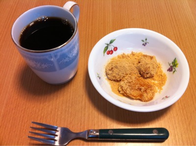 朝食7:00:いそべ餅、りんご、コーヒー