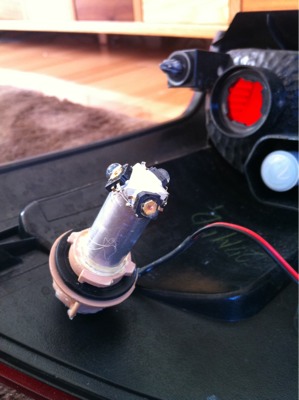 PowerLEDという高輝度のLEDを使ってアルミ棒を放熱板として加工した台座に貼り付けています。このアルミ棒とコネクタの隙間から水が浸入していたようなので、付け根の部分をシリコンで防水処理しました。