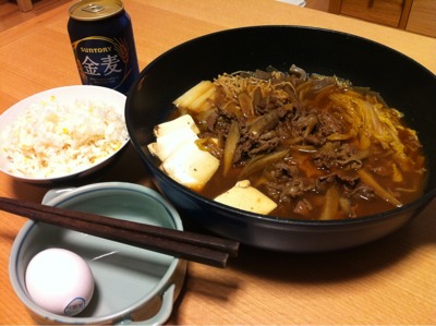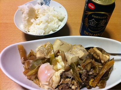 夕食21:00:ごはん、肉豆腐、ビール1本(144)、ハイボール3杯