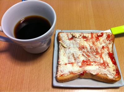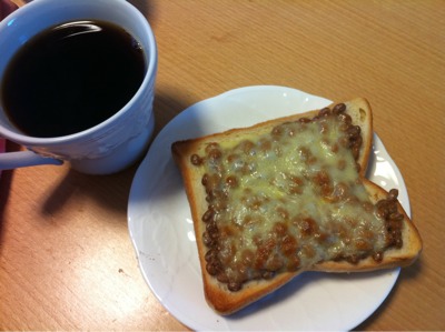 朝食7:00:納豆チーズトースト、ヨーグルト、りんご、コーヒー