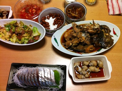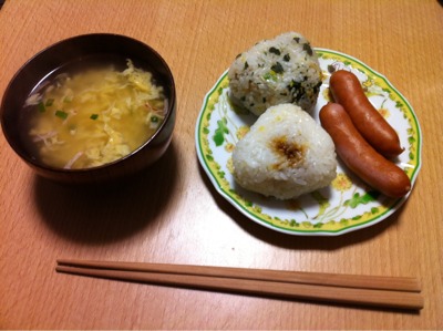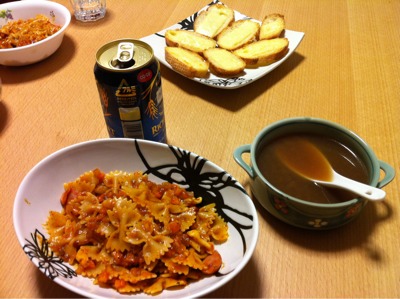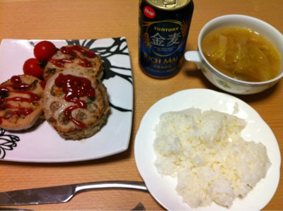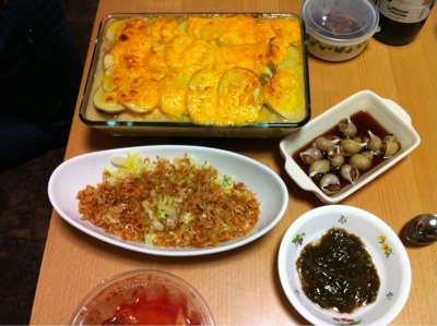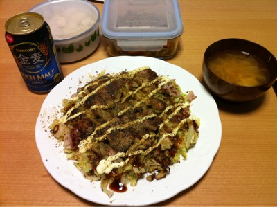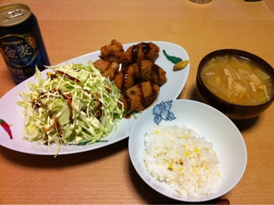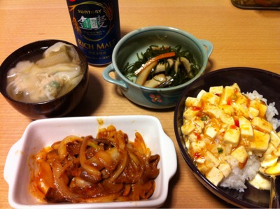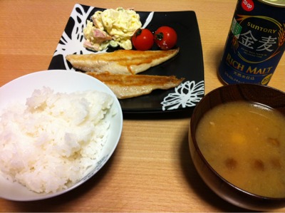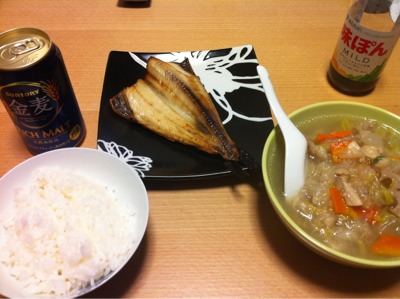 夕食22:00:ごはん、シャケと野菜炒め?、切り干し大根、ビール1本、焼酎水割り1杯