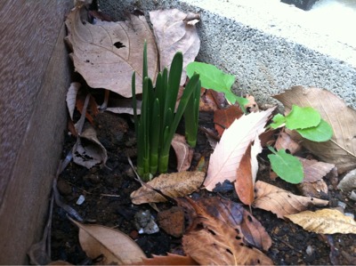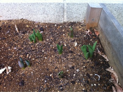 昨シーズンに買った鉢植えの球根を庭に植えていたら芽を出しました。